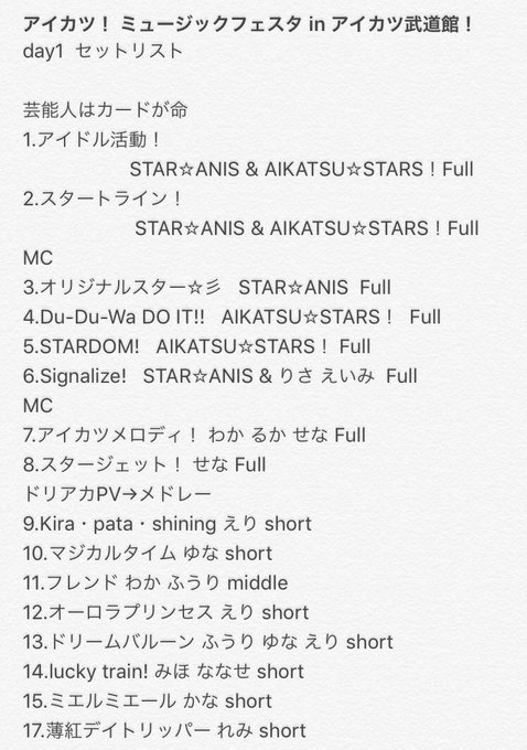 47:Let's アイカツ! 1:アイカツ!ミュージックフェスタ in アイカツ武道館 "Day1" Making Video 2:ドリームアカデミーメドレー 3:地方アイドルメドレーAmazoncojp メーカー特典あり アイカツ!アイカツ!ミュージックフェスタ in アイカツ武道館! とは18年2月27日・28日に日本武道館で開催された、「アイカツ!」及び「アイカツスターズ!」のライブにして、その歌唱担当であったアイドルグループ「star☆anis」と「aikatsu☆stars!